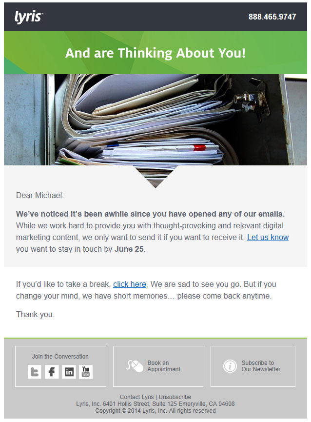 Tipp: Was sich sehr oft bewährt ist ein „augenzwinkernder“ Ansatz. Wie oben bei dem Beispiel mit der Betreffzeile „Wir vermissen Dich!“ bereits suggeriert wird, wurde in dem Mailing von Lyris (siehe Screenshot) auch weiter entsprechend nett und persönlich formuliert: „We are sad to see you go.“ und „Please come back any time.“